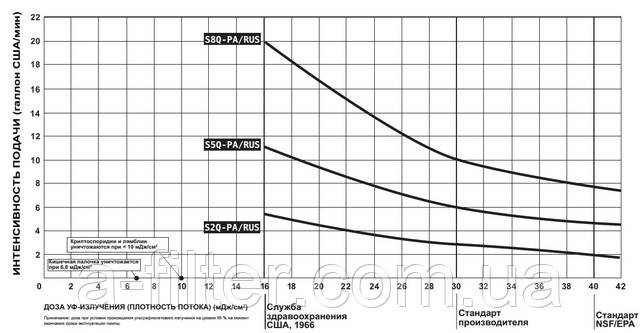 Також одним з важливих факторів, які впливають на ефективність ультрафіолетового знезараження є доза опромінення. Рекомендується продуктивність установки застосовувати при максимальній дозі опромінення - 40мДж/см2 (міжнародний стандарт NSF), яке здатне знищити більше 99% мікроорганізмів, які проходять крізь нього.